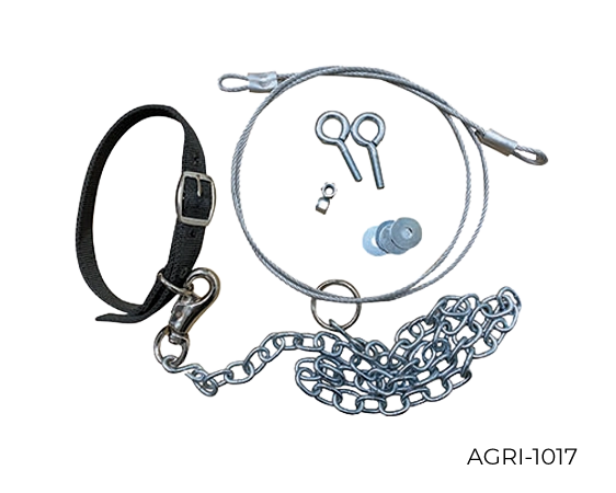 The AGRI-1017 & AGRI-2017 Tether Cable Kits include cable, chain with swivel-eye snap hook, neck strap, and mounting hardware. Offers a secure alternative to fencing, improving calf contact and ease of training.