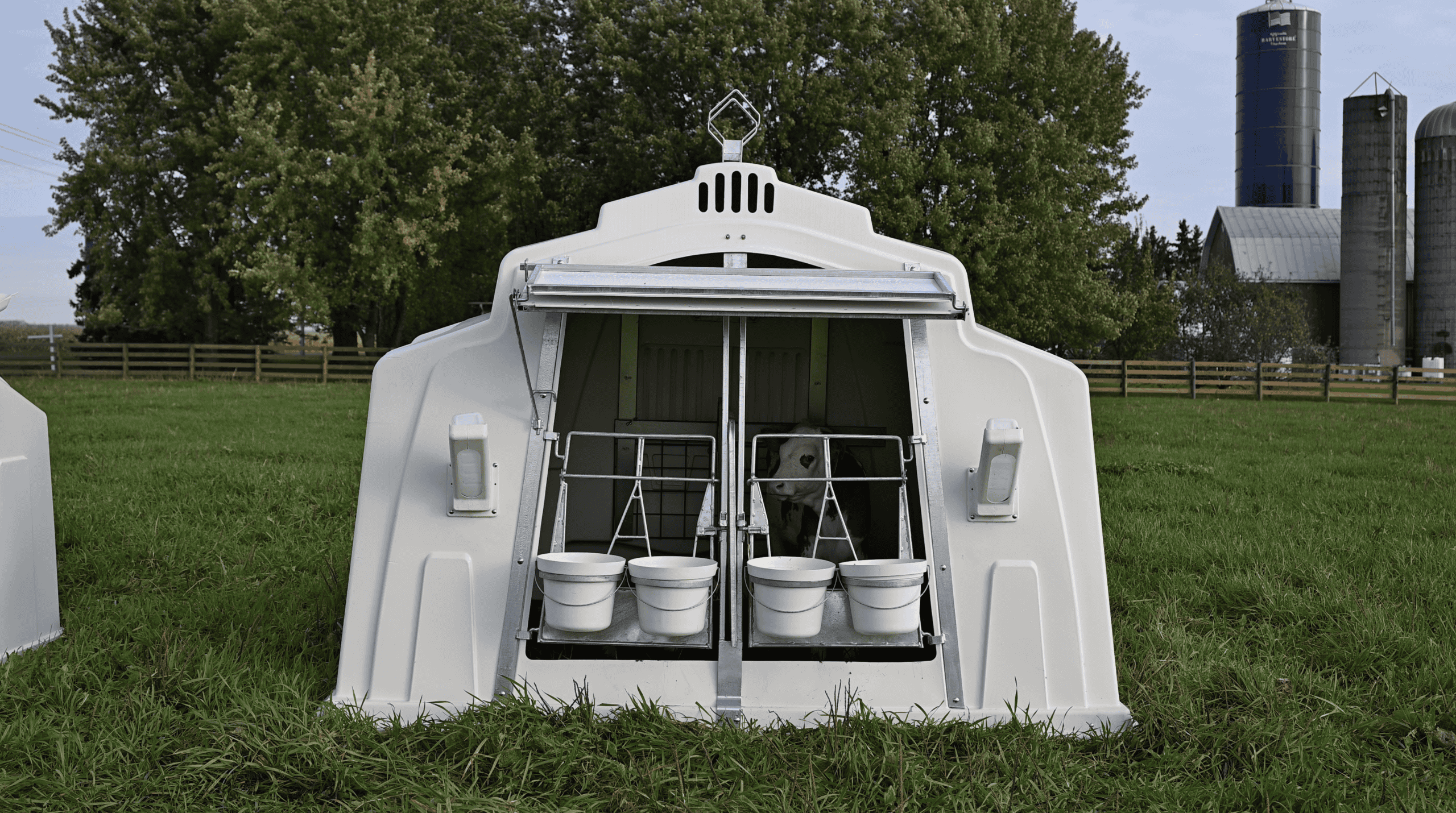 A dual-compartment calf hutch with multi-position awning and optional removable center panel.