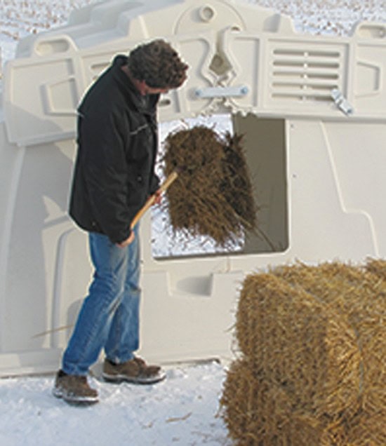 A one-piece molded group calf hutch with superior ventilation and swing-up bedding doors.